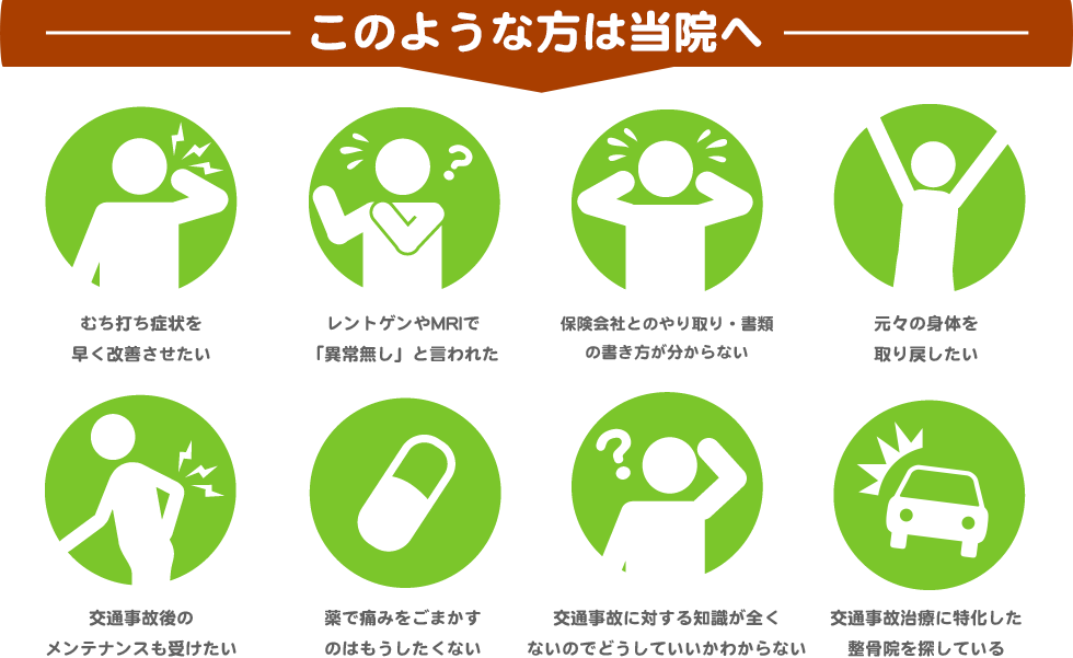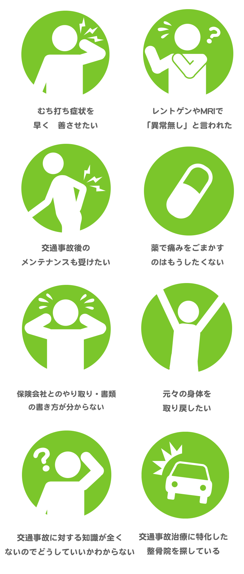 交通事故によるケガは、放っておいても良くなることは無く、そのままにしていると後遺症が残るリスクが高まります。そうならない為には“早期施術・早期回復”が最も重要になります。
